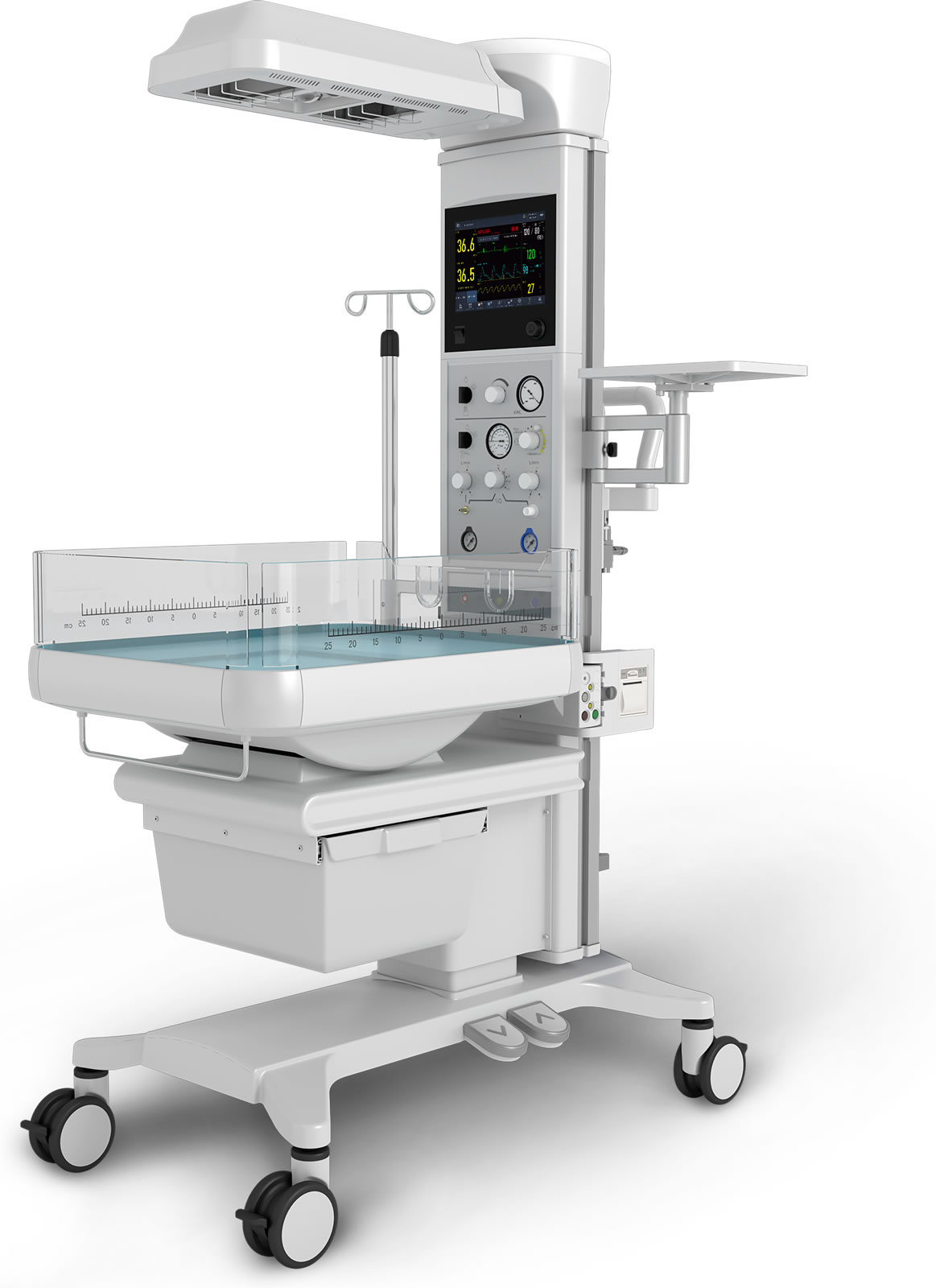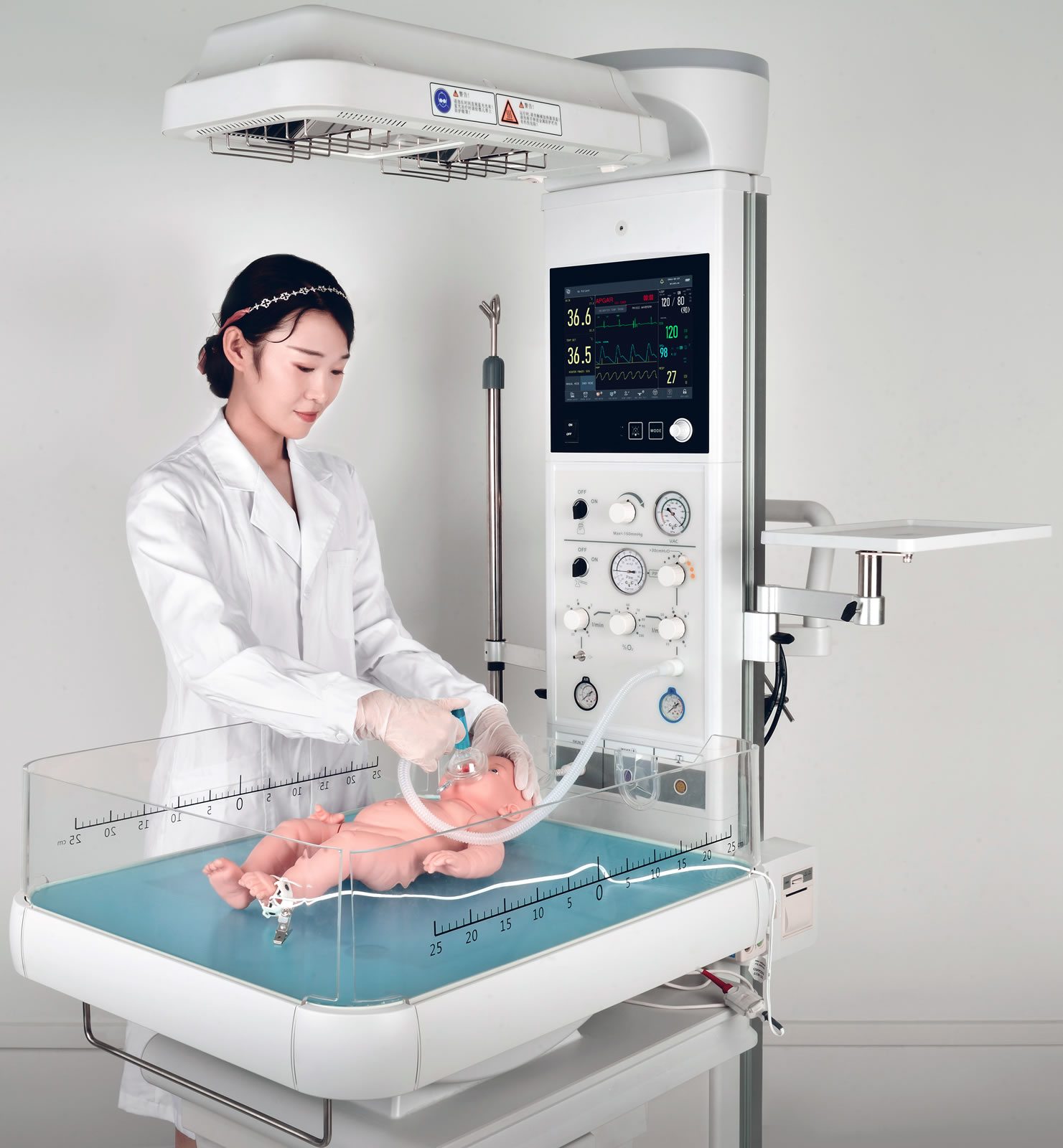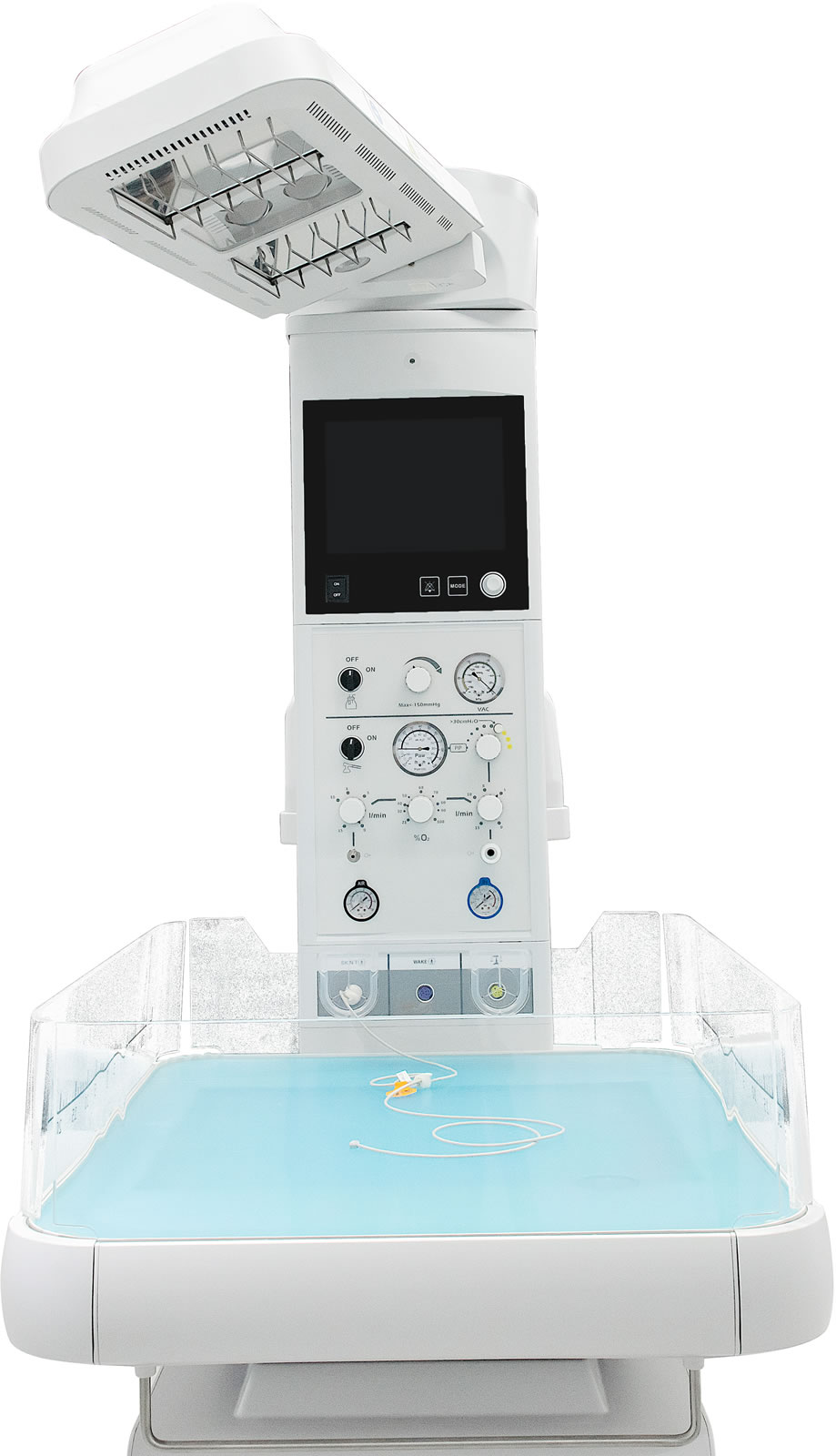 Sistema térmico completo, integra en un solo dispositivo tanto el calor radiante como el sistema de luz azul el módulo de reanimación y el monitoreo de los signos vitales.